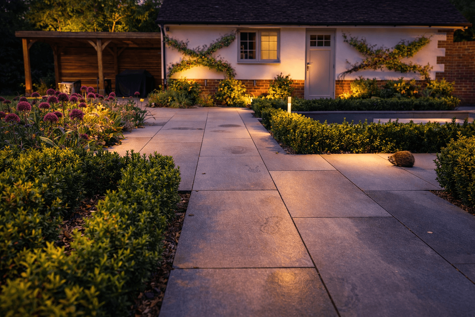 Porcelain tiling · sunken fire pit · lighting · planting · cedar cladding · pergola · design & build