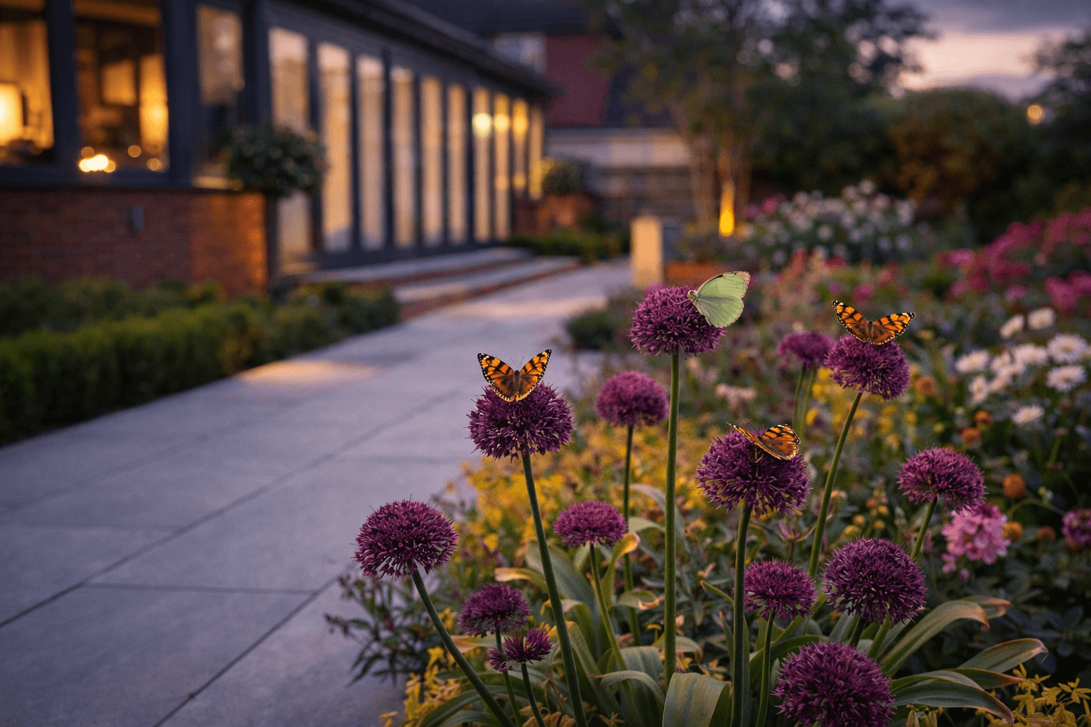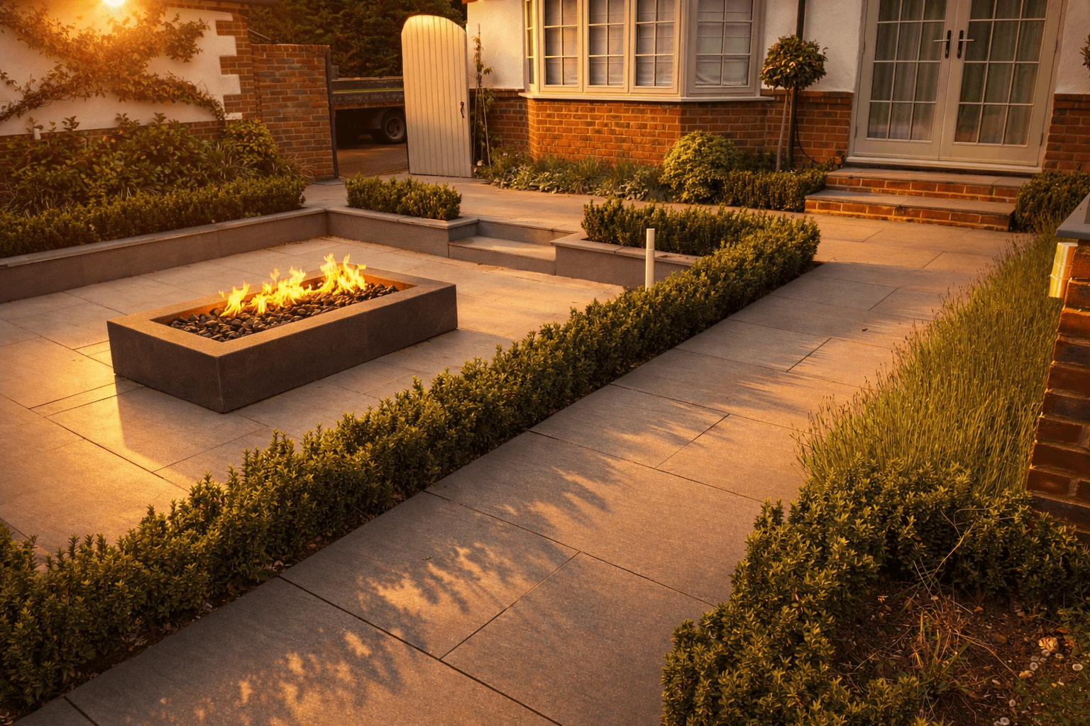 A stylish, modern family garden that seamlessly connects to the new extension, with a sunken fire pit providing a strong focal point and a welcoming space for year-round use.